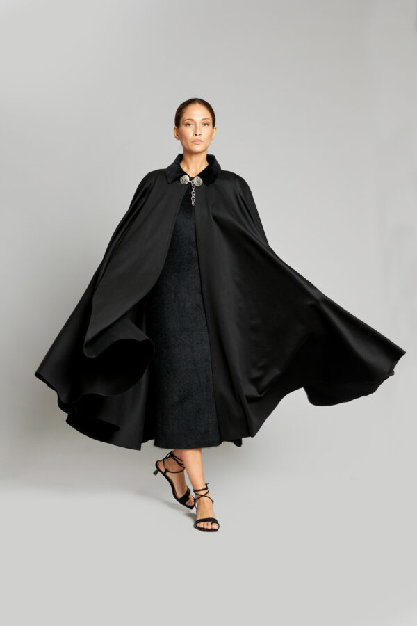 Very wide and long, with a larger collar compared to other models, Lustrissimo is inspired by the tabarro found in the attic of a Venetian nobleman, inside which, on a piece of fabric, the owner’s name had been embroidered, no longer visible, preceded by the term “Lustrissimo,” which means “Lord.” It closes at the front with a chain connected to two fixed studs – called “Mascheroni” – representing the head of the Lion of St. Mark in relief, or with a silk cord loop.